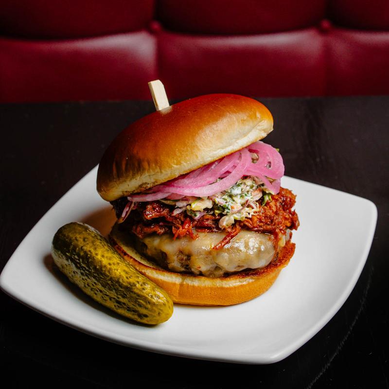 Burger topped with pepper jack cheese, bourbon BBQ pulled pork, house cole slaw, and pickled onions.